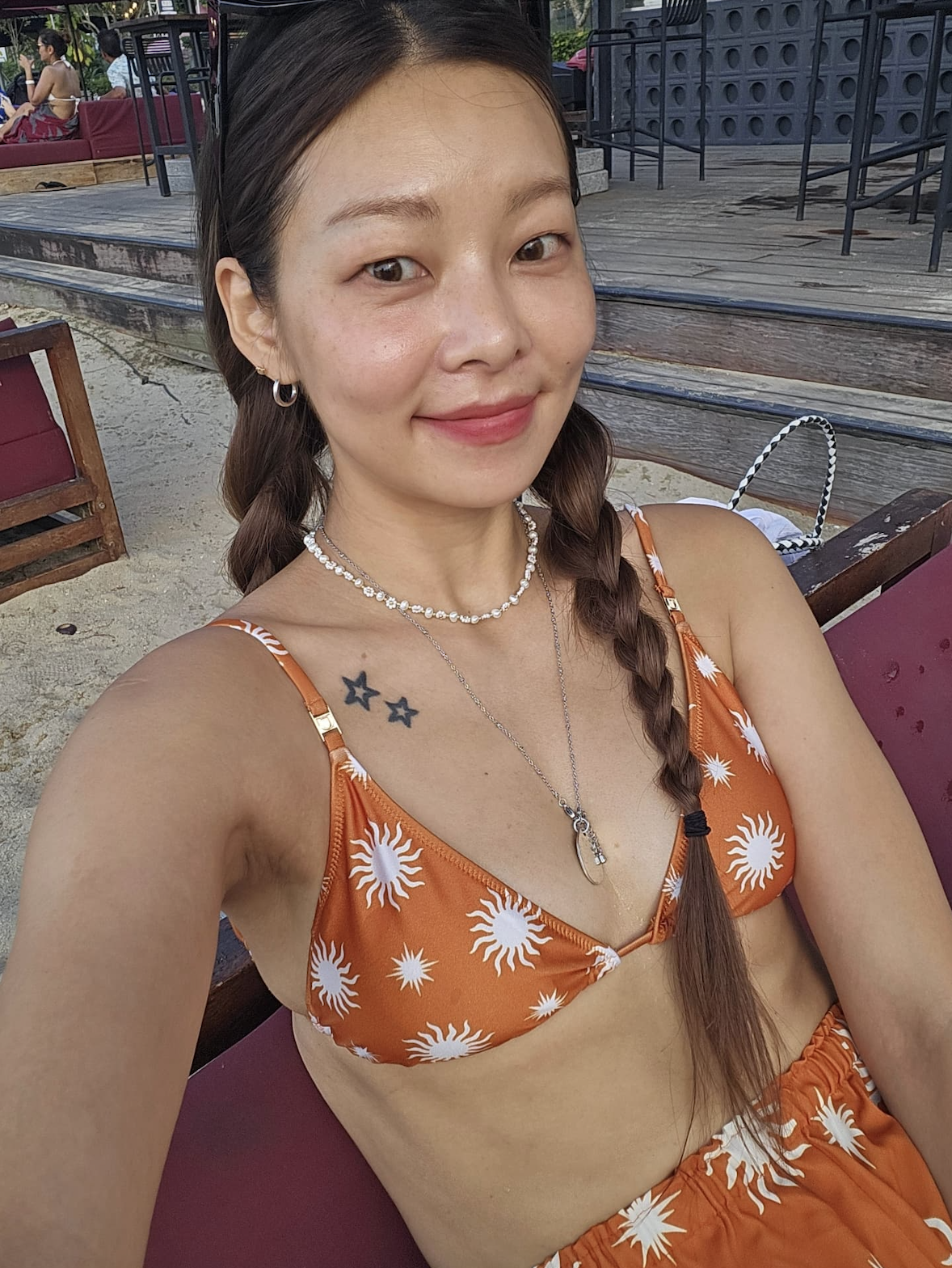 공개된 사진 속 송해나는 비키니 차림으로 마른 몸매를 자랑하며 쇄골 부근에 새긴 별 모양 타투와 선명하게 드러난 갈비뼈가 눈길을 끌었다.
