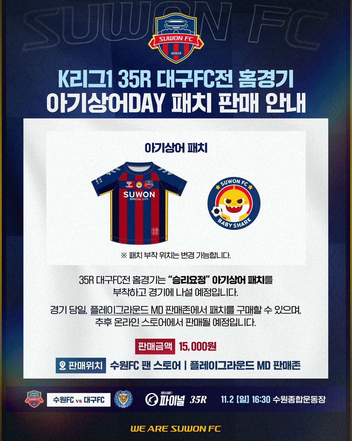 수원FC 최순호 단장은 “더핑크퐁컴퍼니와 협업한 이번 아기상어 네이밍데이는 가족 단위 팬 비중이 높은 수원FC이기에 더욱 뜻깊은 이벤트”라며 “팬들이 이를 통해 더 다양하고 즐거운 수원FC만의 문화를 경험할 수 있도록 계속 노력하겠다”고 말했다.
