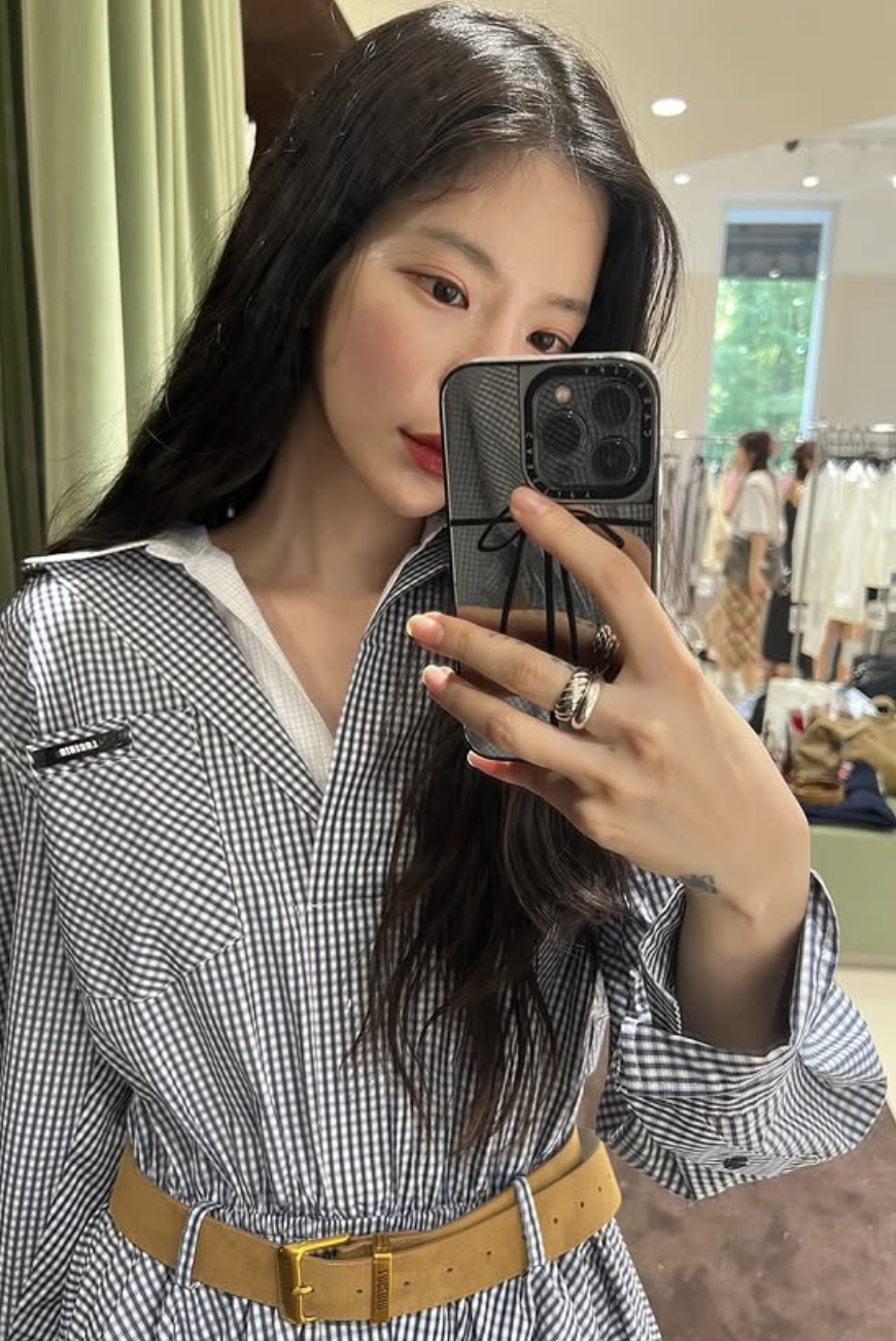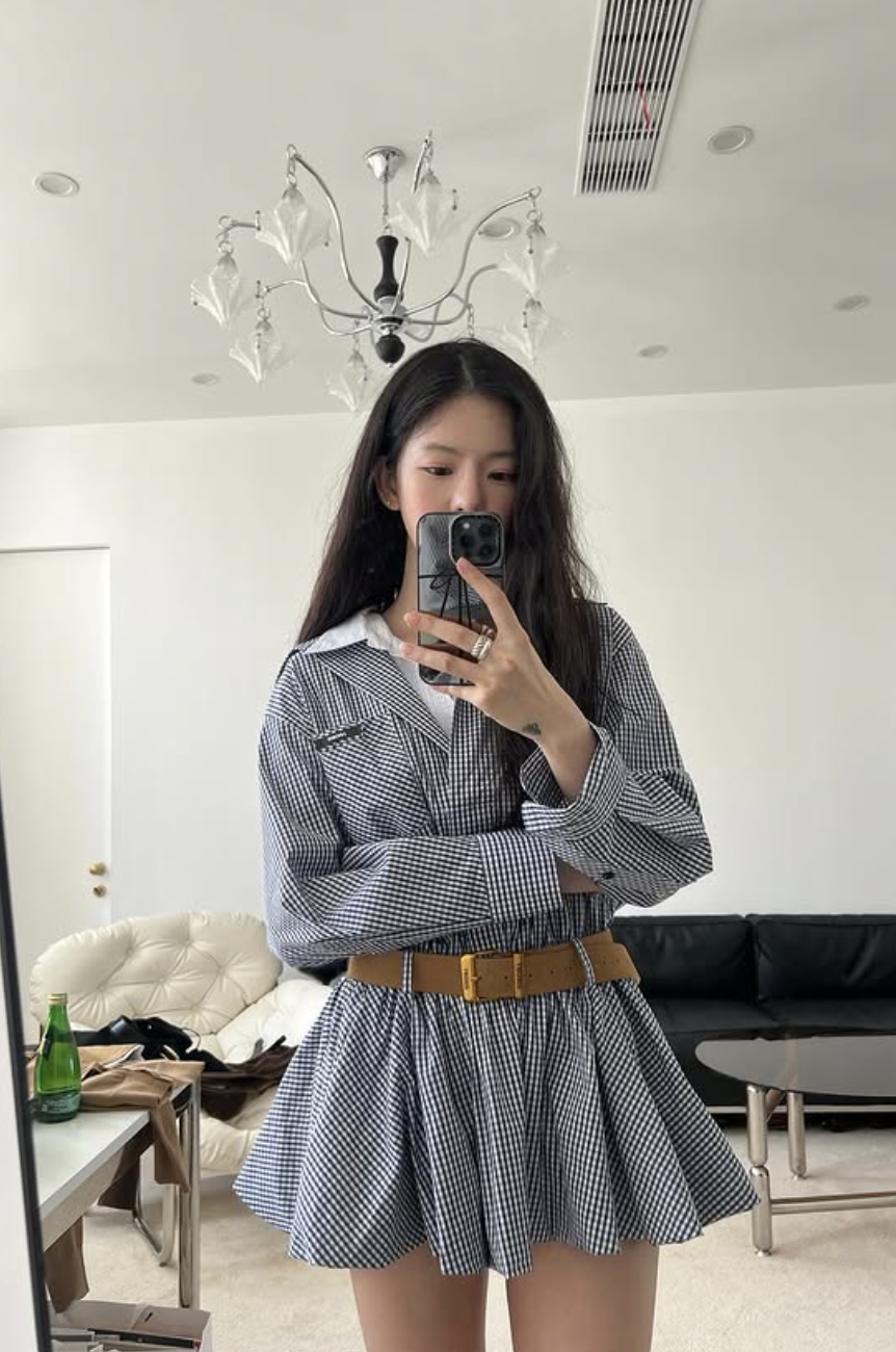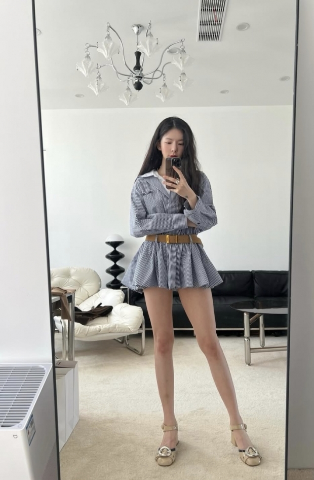 공개된 사진 속 장재인은 짧은 기장의 미니 원피스를 입고 거울 앞에서 포즈를 취하고 있다. 허리 벨트로 포인트를 준 스타일링과 통굽 힐을 매치해 세련된 분위기를 연출했으며, 늘씬한 각선미가 시선을 사로잡는다.