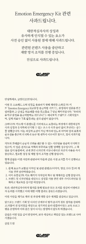 6일 글맆 측은 공식 SNS를 통해 “이번 휴 스프레드 스틱 런칭을 홍보하기 위해 제작한 스페셜 PR 키트 ‘감정 응급처방 키트’를 시각적으로 표현하는 과정에서 대한적십자사의 상징과 유사하게 인식될 수 있는 요소가 포함되는 실수를 범했다”고 밝혔다.