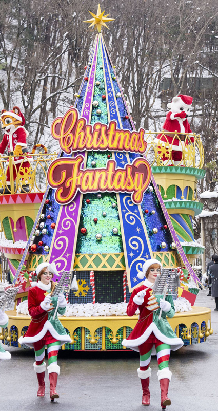 트리·썰매·케이크 등 크리스마스 테마로 디자인된 퍼레이드카에서는 하얀 눈과 비눗방울이 흩날리고 산타·루돌프 등 캐릭터 연기자들은 발랄한 댄스 퍼포먼스를 선보이며 성탄절 분위기를 한껏 끌어올린다.