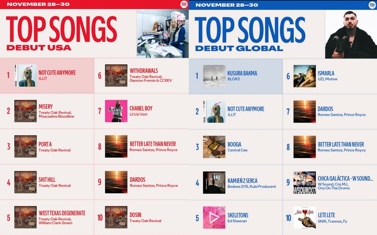 1일 스포티파이 공식 SNS에 따르면 아일릿의 싱글 1집 ‘NOT CUTE ANYMORE’와 동명의 타이틀곡이 11월 28~30일 집계 기준 ‘톱 송 데뷔(Top Song Debut)’ 차트에서 미국 1위, 글로벌 2위를 차지했다.