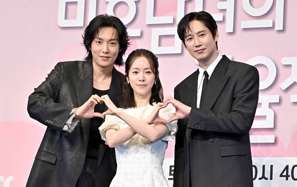 배우 이기택, 한지민, 박성훈(왼쪽부터)이 26일 서울 구로구 더 링크호텔 서울에서 열린 jtbc 토일드라마 '미혼남녀의 효율적 만남(감독 이재훈)' 제작발표회에서 포즈를 취하고 있다.