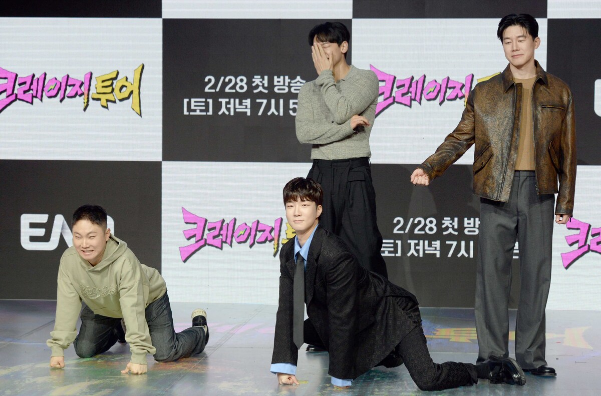 유튜버 빠니보틀, 가수 비(정지훈), 가수 이승훈, 배우 김무열(왼쪽부터)이 27일 마포구 상암동 쇼킹케이팝센터에서 열린 ENA 예능프로그램 '크레이지 투어' 제작발표회에 참석해 포토타임을 갖고 있다.