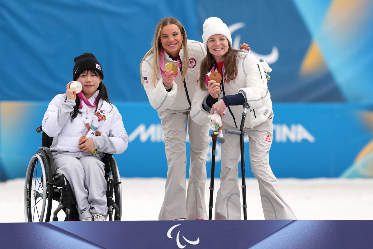 김윤지(왼쪽)가 11일(현지 시간) 이탈리아 테세로 크로스컨트리 스타디움에서 열린 2026 밀라노·코르티나담페초 동계 패럴림픽 크로스컨트리 스키 여자 10㎞ 인터벌 스타트 좌식 결승에서 은메달을 차지한 뒤 시상대에서 포즈를 취하고 있다. 테세로(이탈리아)=AP/뉴시스